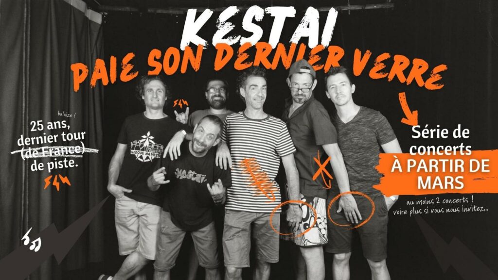 Déjà 25 ans que cette formation écume les bars et les scènes locales avec leur Rock Festif. Après une petite pause, les 6 compagnons décident de remettre le couvert pour leur dernier tour de piste, venez donc découvrir ou redécouvrir leur univers cuivré avec leur énergie communicative. Allez viens, Kestaï paie sa dernière tournée!!!